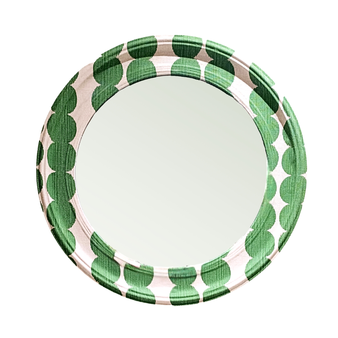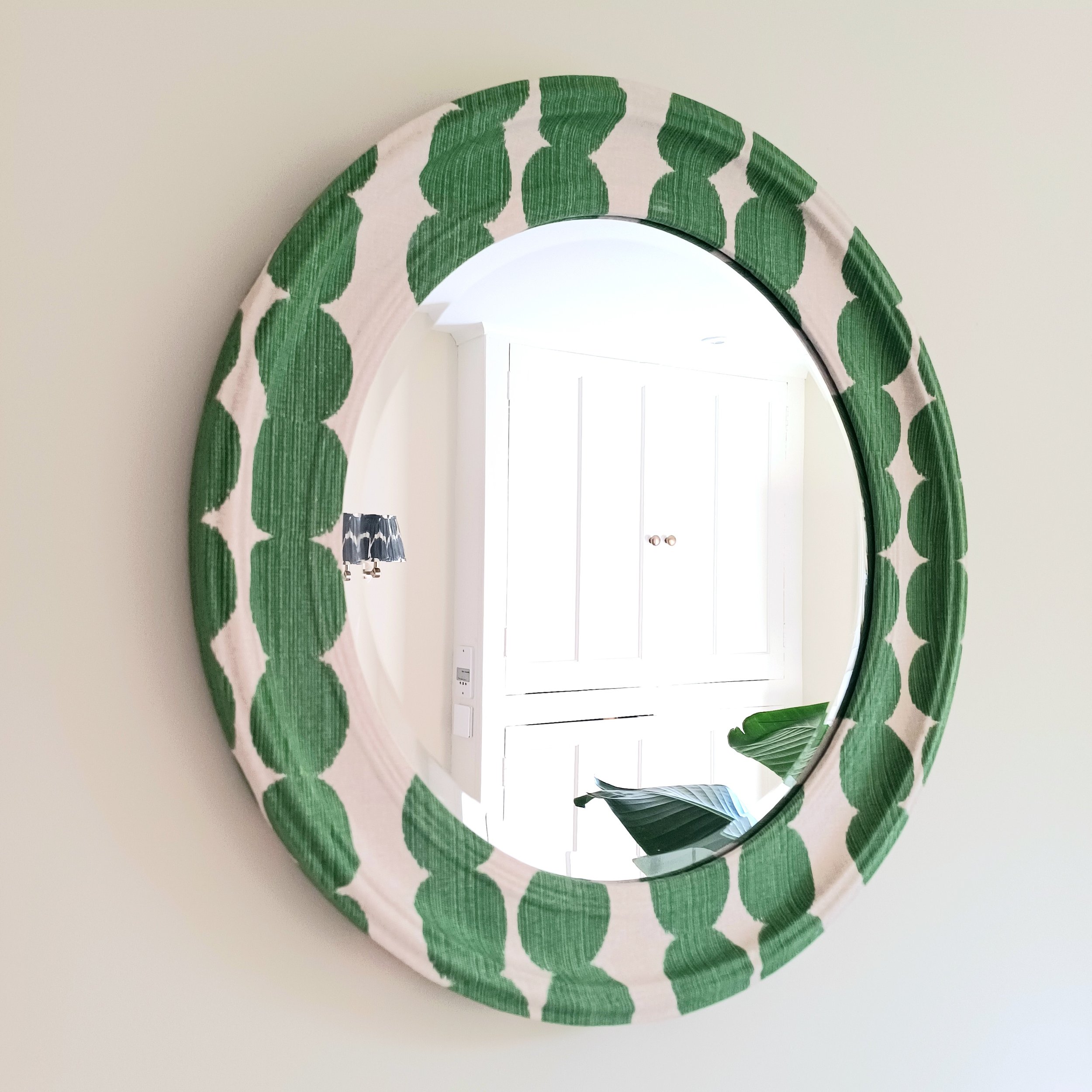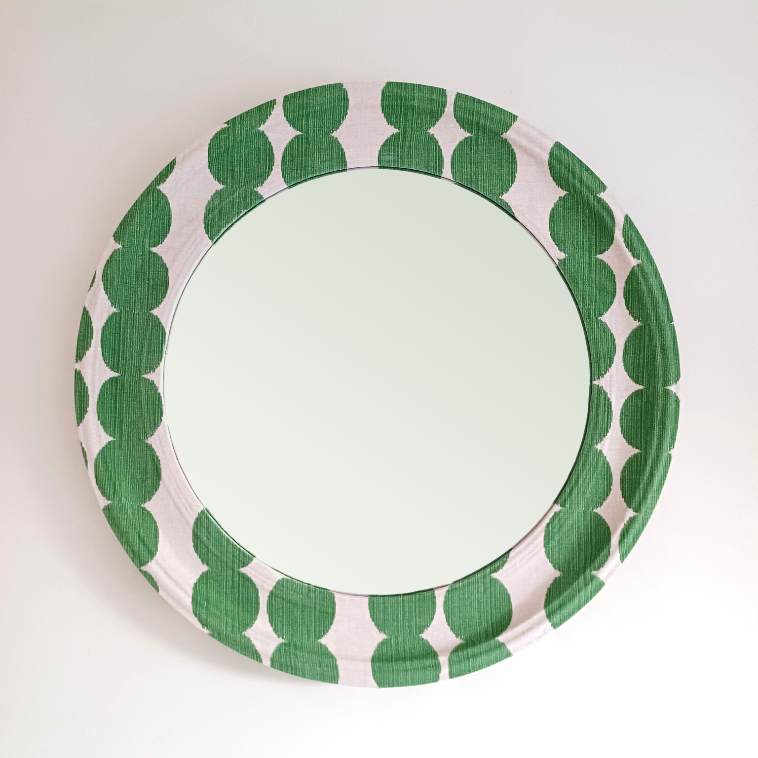 Circular wooden mirror upholstered in ikat-textured 100% cotton fabric.